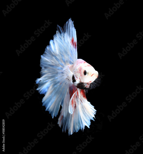 Siamese Fighting Thai Betta Fish With Beautiful White And Blue And Red Colors Is Moving In Various Gestures That Are Ready To Fight In The Black Background Isolate Halfmoon Fish Stock Photo